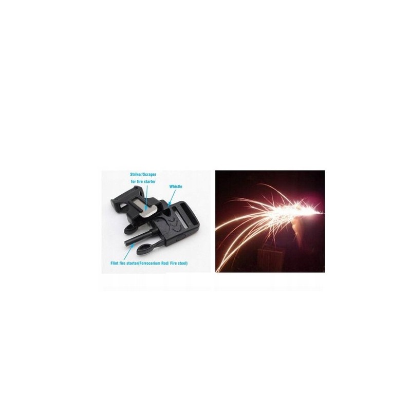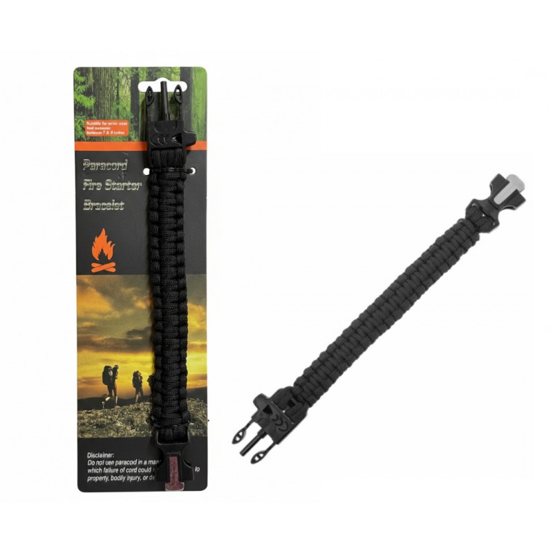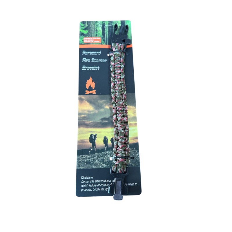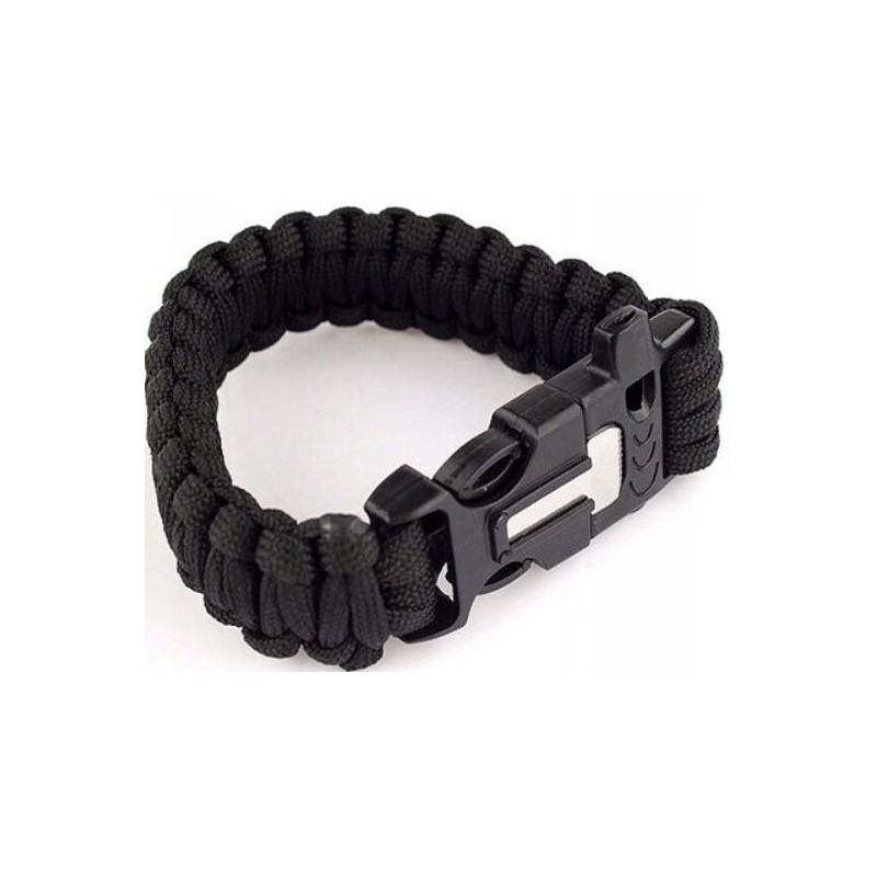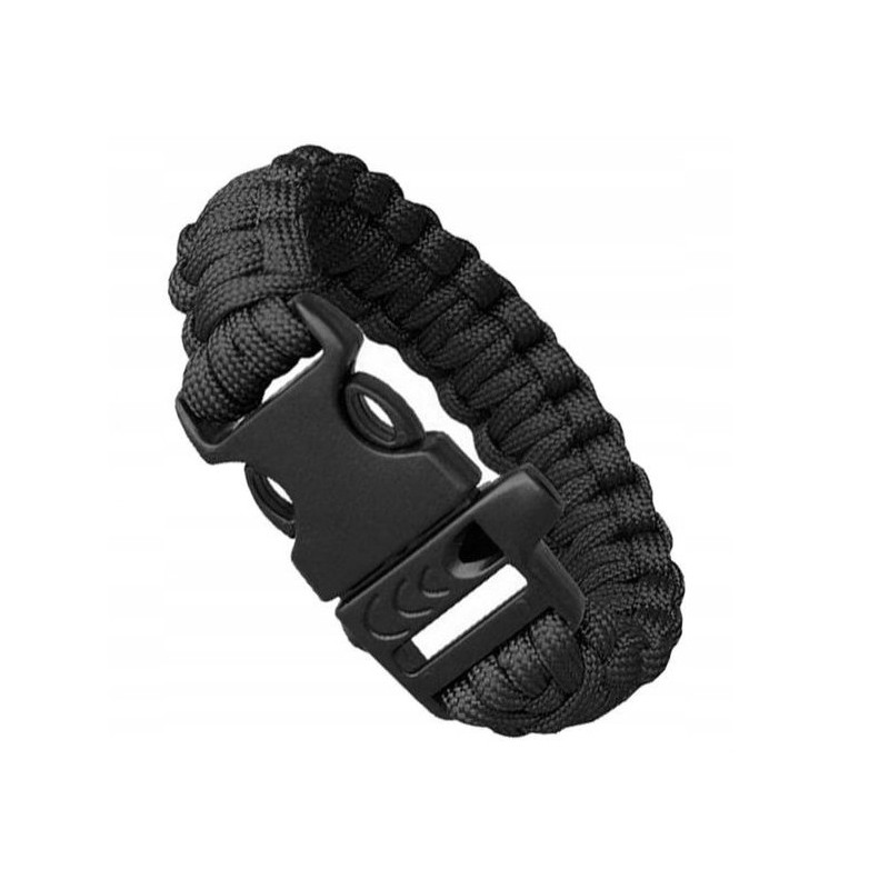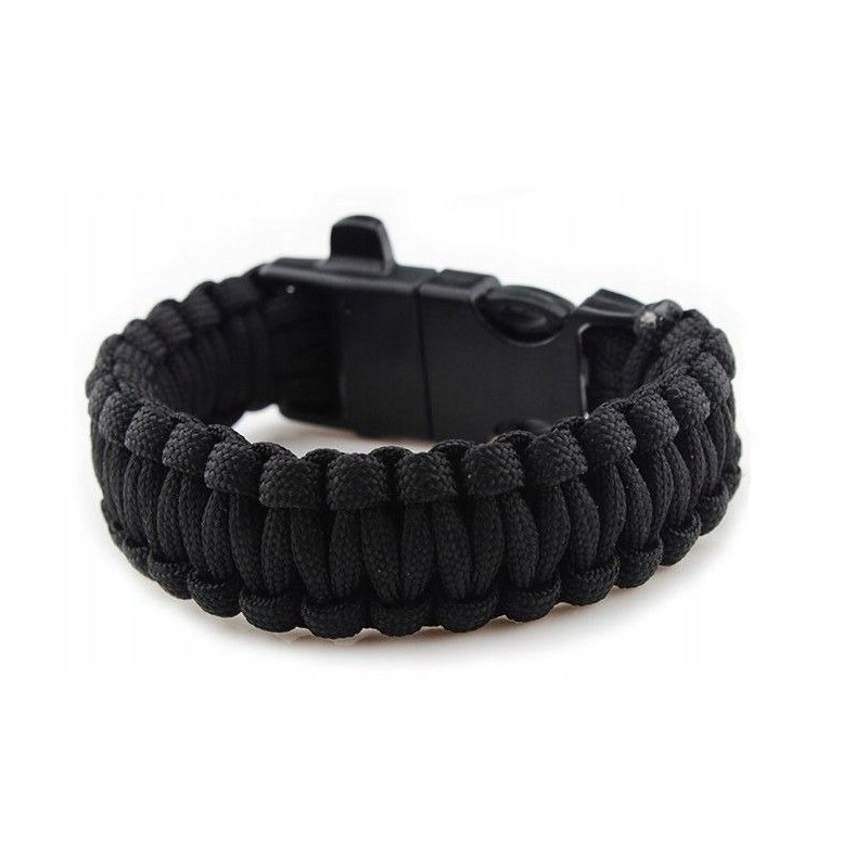 W zapięciu bransoletki znajdziesz krzesiwo, gwizdek ratunkowy słyszalny z daleka oraz mini ostrze do użycia z krzesiwem oraz do innych zadań. Bransoletka wykonana z bardzo wytrzymałego 7 rdzeniowego paracordu. Klamra wykonana z tworzywa sztucznego ABS, w taki sposób, by uniemożliwić przypadkowe jej rozpięcie. Po rozpleceniu otrzymamy aż 3,6 m mocnej i wytrzymałej linki o statycznej wytrzymałości do 250 kg.